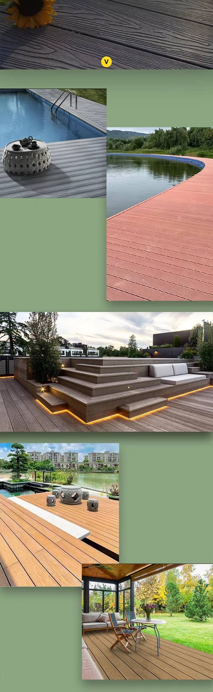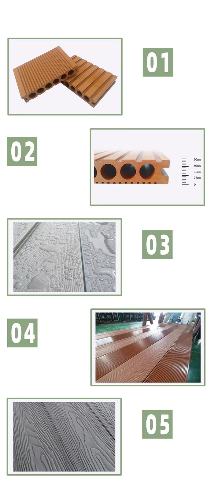 屋外環境: テラス、デッキ、庭園の小道、商業歩行者専用道路など、耐候性、防虫性に優れ、屋外での使用に適しています。