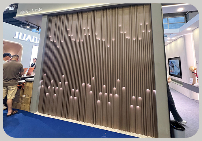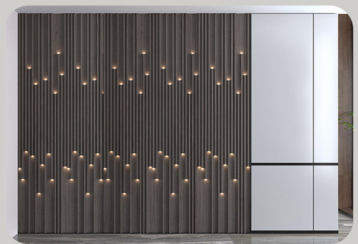 発光グリルウォールパネルは、現代のテクノロジーと装飾的な美学を組み合わせた革新的な製品です。 WPCなどの環境に優しい素材を使用し、パネル表面に溝加工や光ファイバーを埋め込むことで発光効果を実現しています。このタイプの壁パネルは優れた装飾特性を備えているだけでなく、柔らかな照明を提供し、空間の階層感と雰囲気を高めます。その表面は、さまざまな木目調の色で装飾したり、他の素材と組み合わせてさまざまなデザインのニーズを満たすことができます。